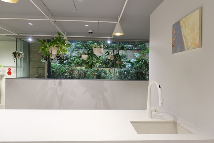 さらに進むと中央にカウンターのあるコミュニケーションのための場があり、その脇にはひとりになれる小さな空間も。オンライン会議その他にも使えそうな場である。この空間の正面には建物外部に植えられた緑が望め、天井からもグリーンが吊るされている。
