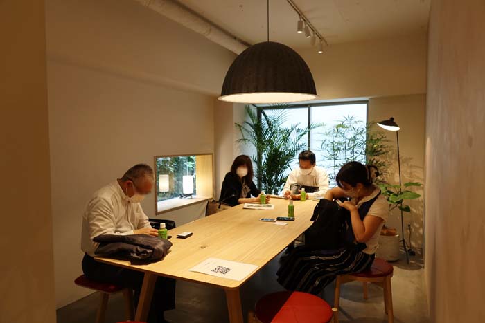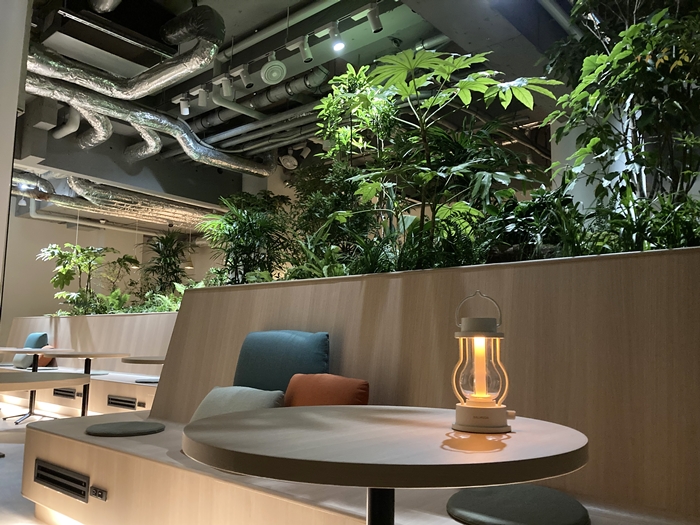 だが、圧巻はその先のワーキングスペースだ。ここには細長いロの字型のテーブルが用意されているのだが、その中央にはテーブルの反対側が見えないほどに植物が植えられているのだ。座ると緑が目前。普通の生活でこれだけ緑を目にすることはほとんどないのではなかろうか。向かいの人の存在など気にならないほどの緑でもあり、これは集中せざるを得ないようだ。