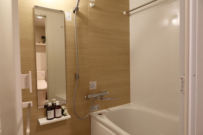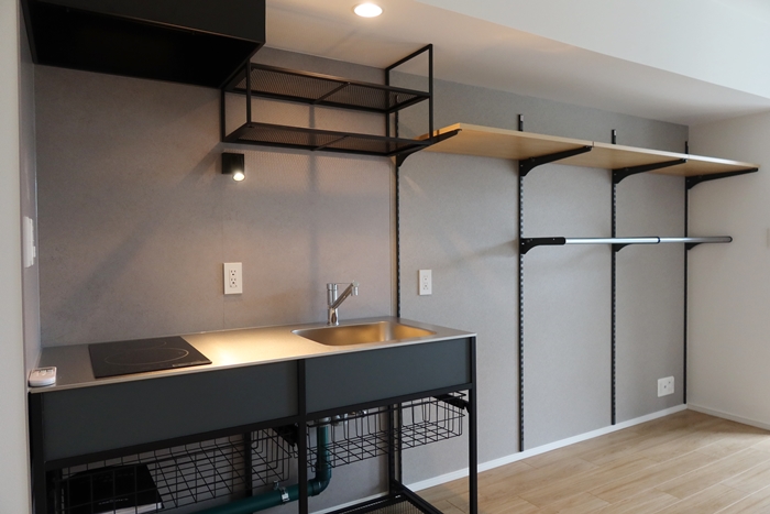 印象的だったのは壁面に用意された可動式の棚や、洗濯ものなどが吊るせるように天井に設置されたバーなど、高さをうまく利用するためのツール類。限られた空間をどう無駄なく使うかがよく考えられているのである。一方で水回りは比較的広めで、バス、トイレ、洗面はそれぞれに独立して用意されている。キッチンはIHで2口だ。