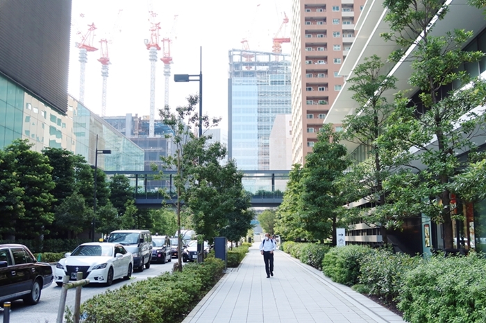 あるいは2020年9月にオープンしたオフィス、住宅からなる東京ポートシティ竹芝のオフィス棟低層部には2~6階に雨、水、島、水田などをテーマにした庭園が用意されており、外から見ると緑の上にビルが立ち上がっているように見える。庭の中には仕事ができる場も設えられている。
