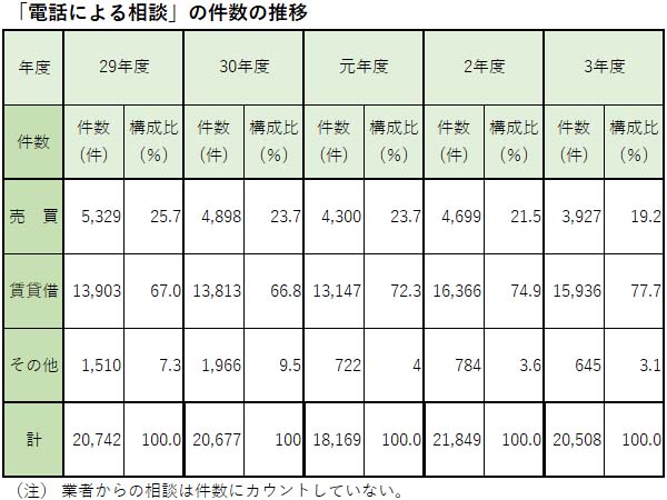 東京都では、電話による相談件数は毎年2万件前後で推移している。内訳としては、毎年のように賃貸借に関する相談件数が最も多く、7割前後の割合を賃貸借が占めている。
