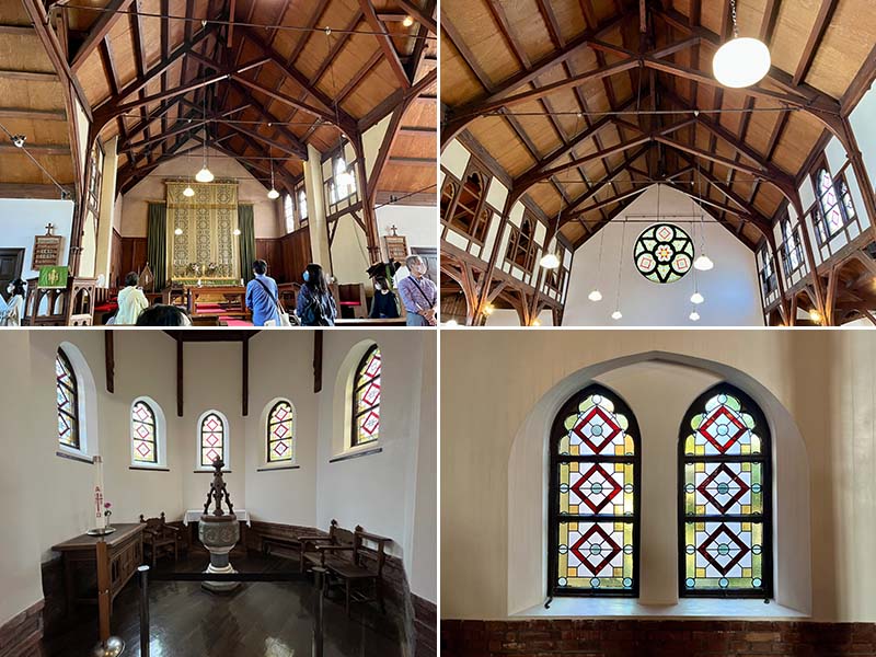 内部は木の構造を現した三廊式バシリカで、幾何学的でありながら愛らしいデザインのステンドグラスがいくつも配されている。やさしい雰囲気の空間が「乙女の守護者」と呼ばれる聖アグネスの名にふさわしく思えた。