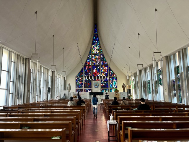 その正面の階段を上がったところが「聖フランシスコ・ザビエル聖堂」だ。中に入ると、屋根の形をそのまま現した上昇感のある大空間の正面に、色鮮やかなステンドグラスを背にした祭壇がある。空に向かって伸びていくようなステンドグラスの上の方に、「神の子羊」が描かれている。