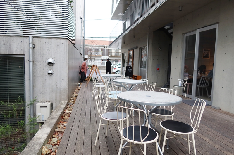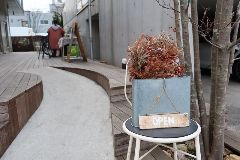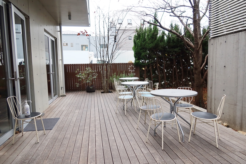 左手にはベーカリーへの入り口があり、その奥にはカフェへの入り口も。ウッドデッキにはテーブル、ベンチが置かれているのでテイクアウトした品を外で食べることもできる。もちろん、買い物をした人以外が利用してもいい空間である。取材にお邪魔した日にはコワーキングスペースを利用している人が手作りのリースなどを販売していた。