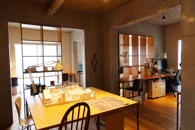 「この建物の躯体は1階から4階まで一部を除き、すべて3.2m×3.0mのグリッドで造られています。そうすることで型枠廃材を削減、作業の手間を軽減、加えて空間の可変性が担保できます。内部の空間を部屋として分割する際にはブロックと構造用合板を利用、簡単に仕切ったり、広げたりができるようになっています」と剛司氏。