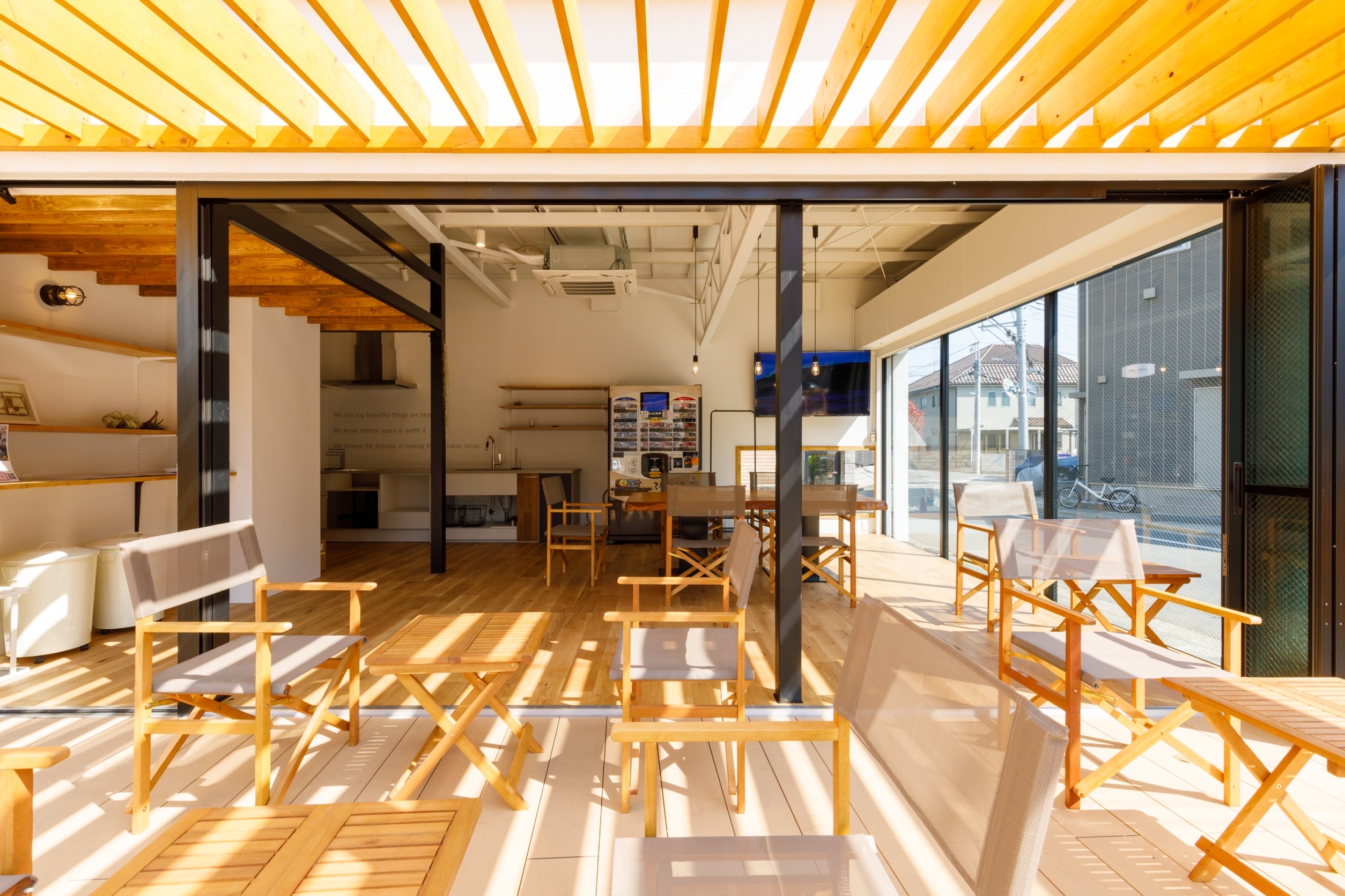 「もともとの倉庫の雰囲気を生かして天井その他はそのまま、塗装しただけで使っています。大きく変えたのはウッドデッキ側。壁だったところを全面開けられるようにし、ウッドデッキと一体化して広い空間として使えるようにしています」