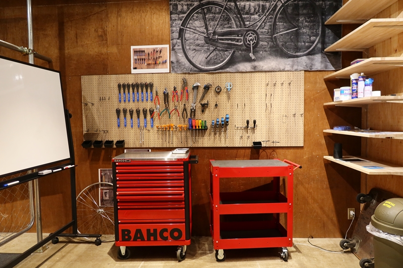 日曜日には工具を備えた施設1階で自転車整備の専門学校に通う、メンテナンスに詳しいスタッフ・村中洋輝さんが整備のサポートをしてくれる。個人で全部揃えるにはちょっと躊躇する工具が揃っており、そこに詳しい人がいれば鬼に金棒。大事な自転車を安心して整備することができるだろう。