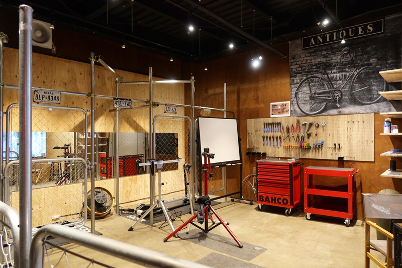 他の建物へはリビングテラスの後ろを通って向かう。まず、一番手前にあるのが会員制のラウンジ&サイクルピットSTAIRS。1階が作業場、2階がラウンジとなっており、自転車の手入れをしたり、仲間と集まったりするための場となっている。トレーニング後のためにシャワー室、更衣室に鍵付きロッカーが設置されている。雨の日にもトレーニングできるキッカーローラーも2台用意されている。