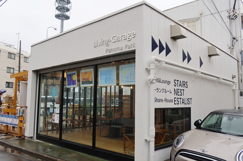 京王線調布駅から武蔵境通りを行くと最初に目に入るのはウッドデッキのある平屋の建物。Living-Garageと呼ばれる地域に開かれた誰でも利用できる施設で、キッチン、トイレ、エアコンに自動販売機が用意されており、Wi-Fiも使える。