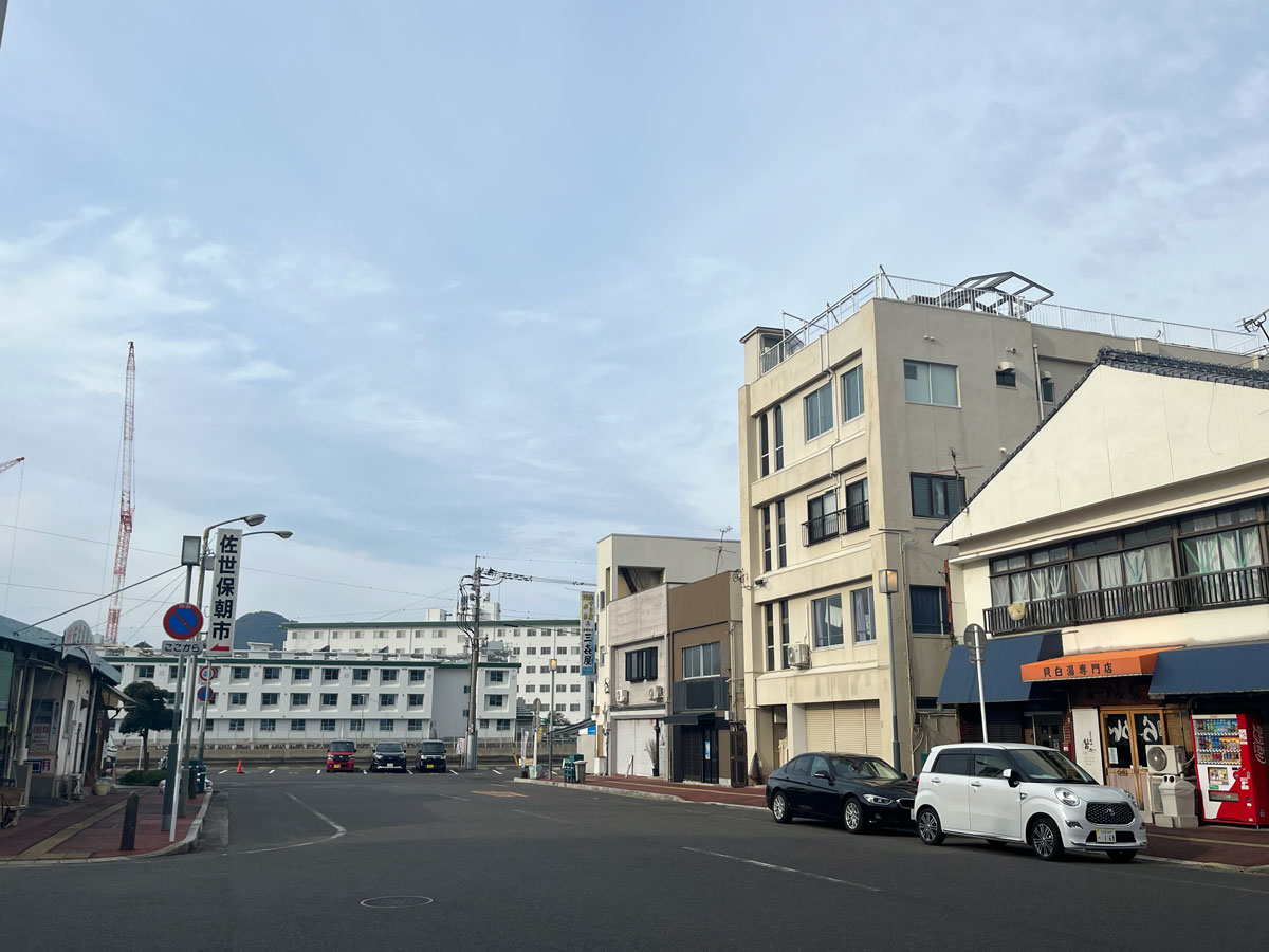 駅を降りると、そこは西の果てのまち。道幅の広い道路をてくてくと歩いていると、500mほど先にある佐世保港から潮風が吹き抜けてくる。佐世保港から5分ほど車を走らせれば、海上自衛隊と在日米軍海軍の基地、巨大な250トンクレーンや大型軍船を望むことができる。軍港として栄えた長崎県佐世保市は、さまざまな文化が混ざり合うまちだ。