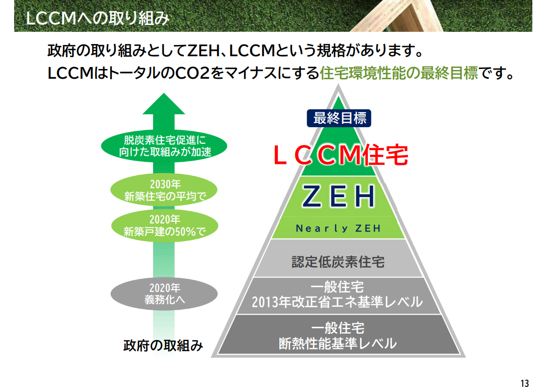「LCCM住宅」とは、「ライフサイクルカーボンマイナス住宅」の略称で、住宅の建設時から運用(居住)時、また廃棄までのサイクルをトータルに考えて、CO2の収支をマイナスにする住宅のことを意味する。
