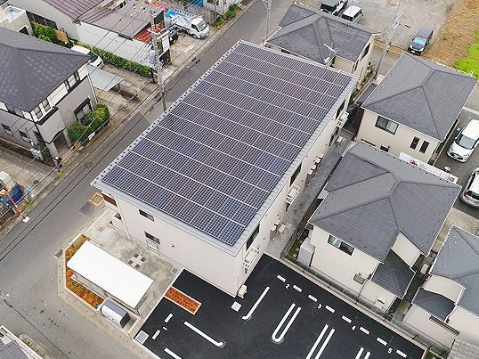 その第1棟となるのが、2021年7月、埼玉県草加市に完成した日本初の「LCCM賃貸集合住宅」だ。同社の6世帯用の木造2階建てZEH規格商品をベースに断熱性能を高め、屋根の形状を片流れにすることで太陽光パネルの搭載面積を最大限にまで増やした。また2×4材の製材時における乾燥工程に、バイオマス燃料による乾燥機を利用することで、建物製造時のCO2 排出量を大きく削減している。