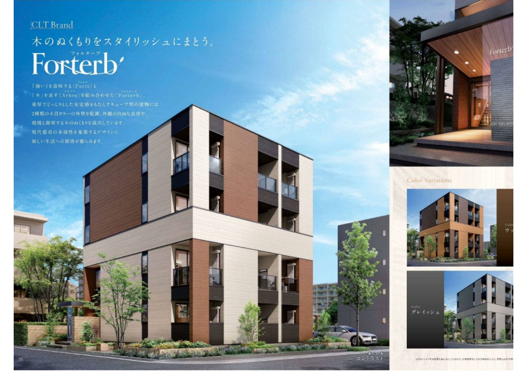 従来は破棄されていたような端材を有効活用できるCLTは、林業・木材産業の活性化、CO2排出量削減や森林保全にもつながるとされる。同社ではそのような視点から、2019年10月にCLTパネル工法による木造4階建て賃貸住宅「Forterb(フォルターブ)」の販売を開始。