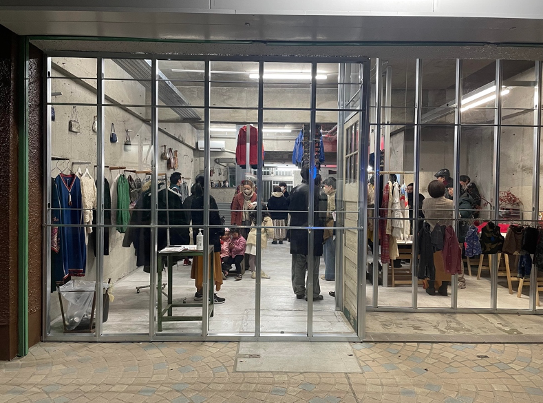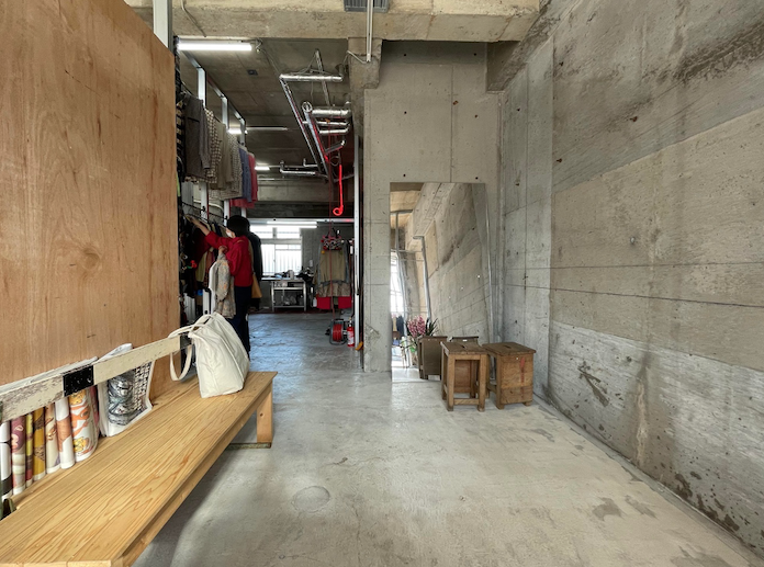 古着屋の新店舗の設計施工は突貫工事だった。資金もなかったのでクラウドファンディングで集めたという。それでも普通の施工はできず、ホームセンターで資材を集め、多摩市のリサイクルセンターで家具の端材などを集め、工事は横溝さんと山下さん、先述の豊ヶ丘商店街のイベントで知り合った工学院大学の建築学生数名で行った。