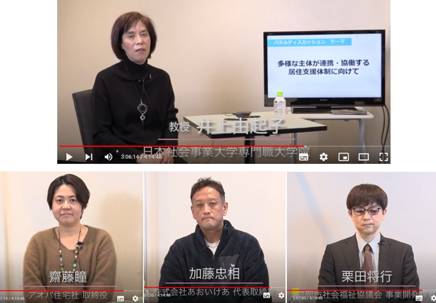 パネリストは居住支援を行う事業者から、アオバ住宅社 取締役 齋藤瞳氏、株式会社あおいけあ 代表取締役 加藤忠相氏、福岡市社会福祉協議会(以下、福岡市社協) 事業開発課長 栗田将行氏が迎えられ、それぞれの居住支援事業について興味深い話を聴くことができた。