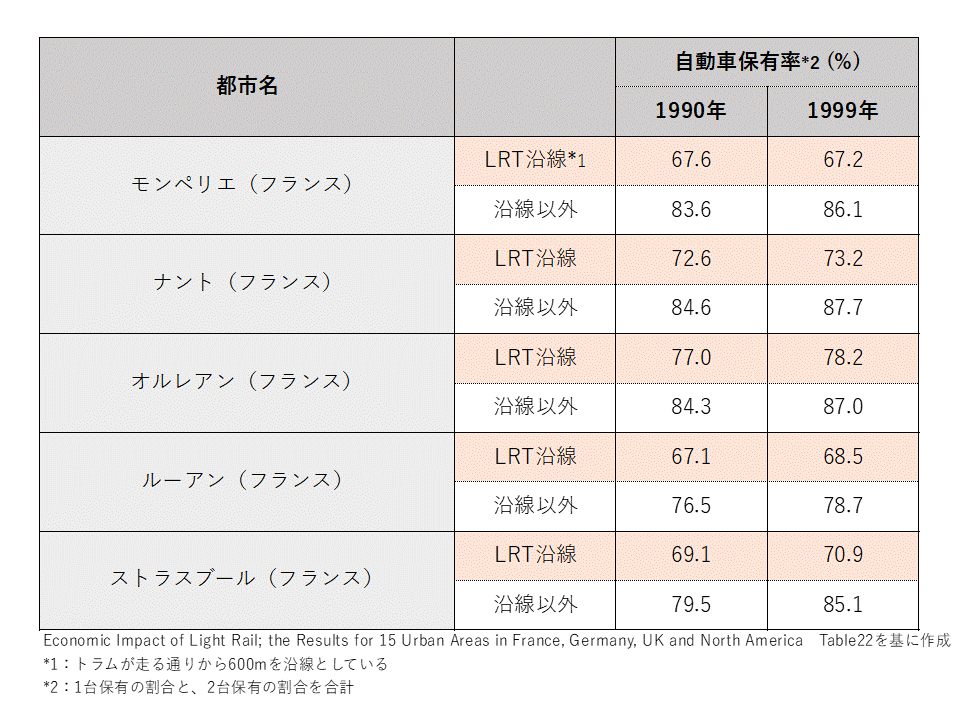 LRT(MAX ブルーライン)が開業した1998年以降のポートランドの1人当たり自動車走行量は、全米平均を上回る減少が継続しているとされる(※3)。また、フランスの5都市で、LRTから600m以内の沿線とそれ以外の1990年と1999年の自動車保有率を比較したとき、いずれの都市もLRT沿線のほうが自動車保有率の上昇が抑えられているという研究もある(※2)。これらのことから、LRTには自動車の利用を抑制する効果があるとも考えられる。