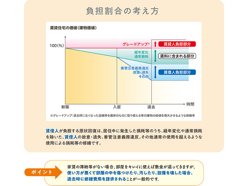 また、契約期間中の修繕に関しては、賃貸借契約書に取り決めがなされていることが一般的である。国土交通省が示す賃貸住宅標準契約書では、以下のような文面となっている。(甲は貸主、乙は借主)