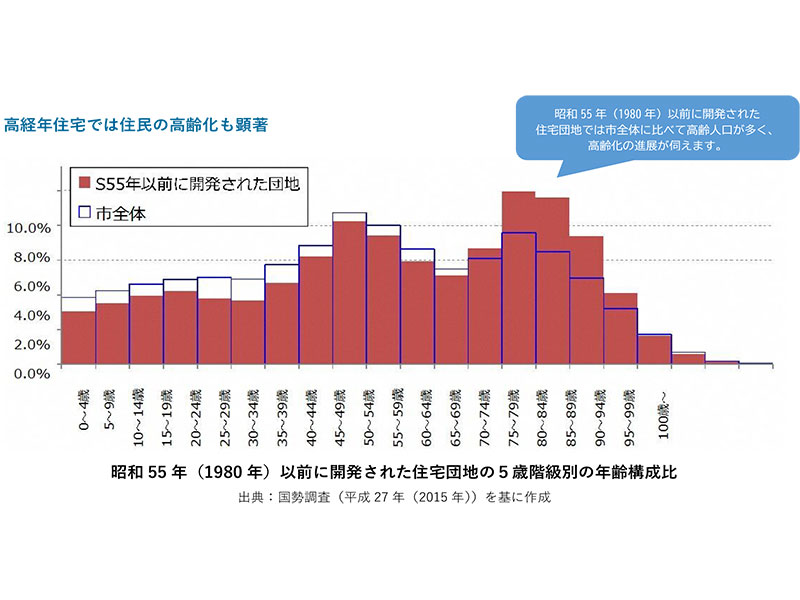 団地は戦後の住宅不足の状況においては、一気にまとまった戸数の住宅を供給できるというメリットがあった。しかしながら、団地は若い世代が同時期に入居する傾向があり、そこに住んだ人たちが団地とともに高齢化するという特徴がある。花見川団地では建物も高経年化しているが、住民の高齢化も顕著になっている。団地内には空き家も増加しており、スポンジ化も生じている。