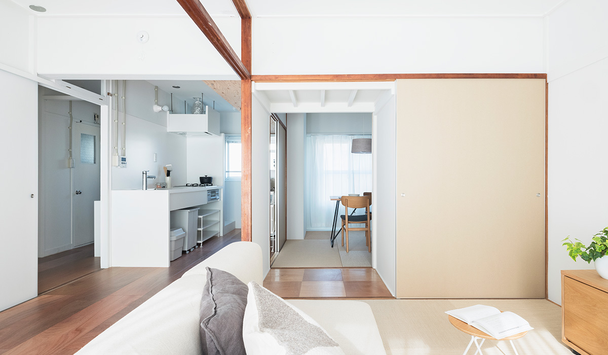 襖で間取りを変化できるプランでは、もともと存在した押入れの一部を撤去し、大きなLDKの空間を作り、そのLDKを襖で開閉できるようにして1LDKと2LDKを自在に変えることで、住む人の家族構成やライフスタイルに合わせながら自由に間取りを変化できるようにしている。