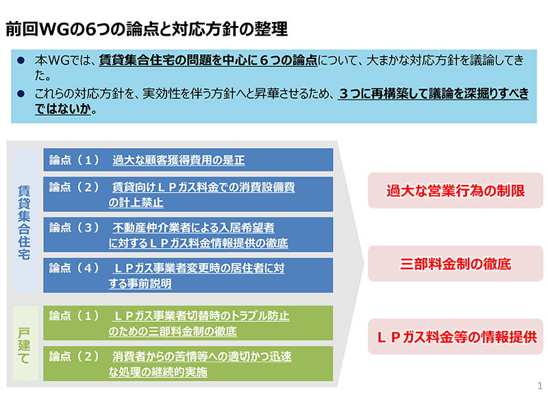 賃貸住宅のLPガス料金の問題は、長年指摘されてきた問題であり、国としては経済産業省が中心となって対策を行ってきている。具体的には、「総合資源エネルギー調査会 資源・燃料分科会 石油・天然ガス小委員会 液化石油ガス流通ワーキンググループ」という有識者会議によって対策が議論されている。