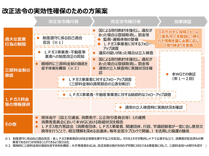 ワーキンググループでは、「液化石油ガスの保安の確保及び取引の適正化に関する法律」の法改正を検討している。2023年7月24日に開催されたワーキンググループの資料によると、主に以下の3つに関連する法改正の議論がされている。