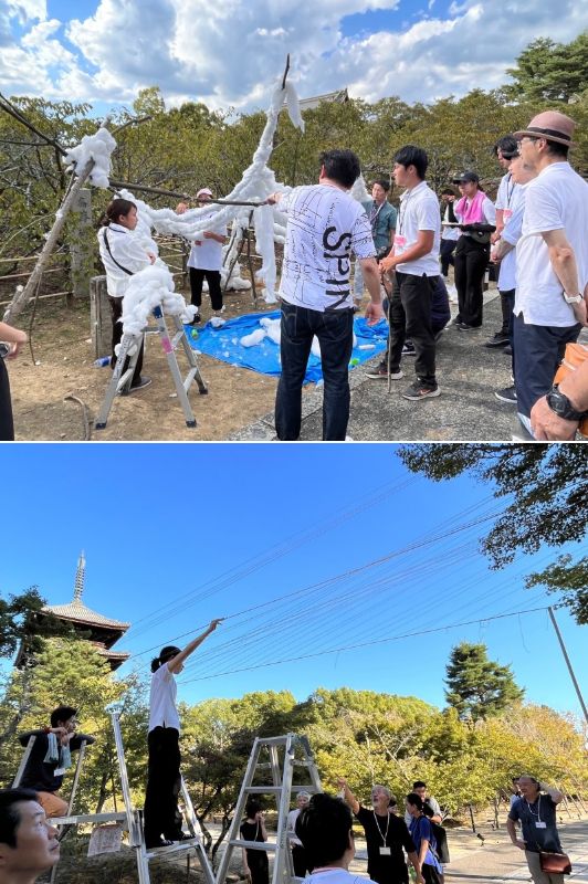 6班の計画地は二王門。高さ18.7mという"剛"の印象を受ける門に対して、雲のようにふわふわと漂う"柔"のフォリーを作り、調和しつつも対比した造形を目指した。風が強くなるとドラゴンのような迫力のある動きも見せ、自然があることで成り立つ造形や揺らぎも評価につながった。