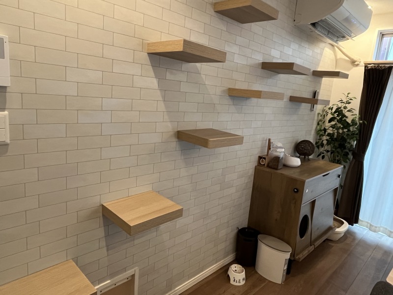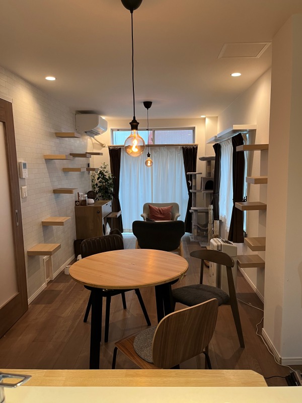 猫と暮らすために、玄関にはオーダーメイドの猫脱走防止柵、リビングには猫ドアとキャットウォークを設置し、4つの個室の扉は猫ドアと鍵のついたタイプに変更。保護猫を2匹譲渡してもらった。