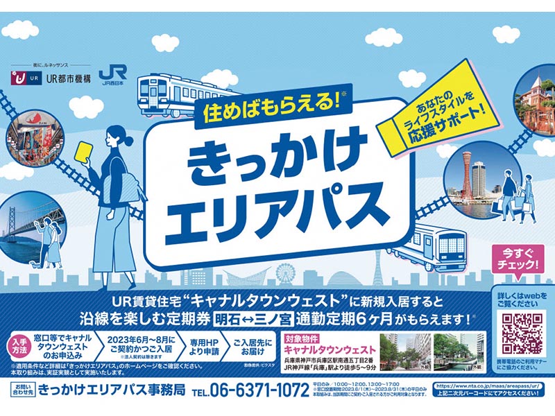 この包括連携に基づき、UR西日本支社とJR西日本が神戸市兵庫区にあるUR賃貸住宅「キャナルタウンウェスト」で実施したのが「きっかけエリアパス」の提供だ。2023年6月1日~8月31日の実施期間中に「キャナルタウンウェスト」に入居し専用ホームページから申し込み手続きをした人を対象に、JR明石駅~JR三ノ宮駅の記名式ICOCA通勤定期券を渡す取り組みである。