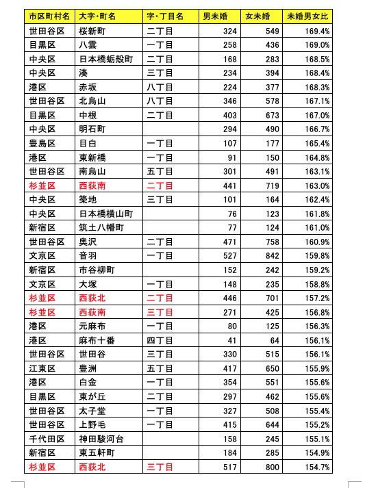 しかし未婚者に限ると西荻は3.4%で60位に上がる。1位は吉祥寺で12%であるから差はまだ8ポイントほどある。