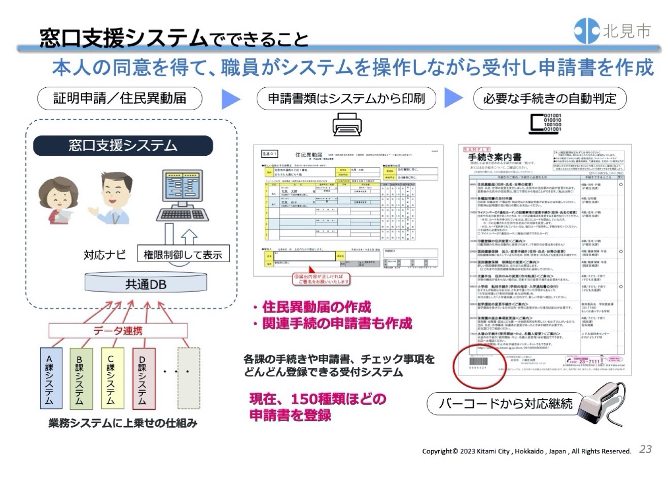 北見市役所は「窓口課」という住民サービスに特化した課を設置している。その窓口課が「書かないワンストップ窓口」となって対応をすることになっている。窓口課で来庁者にワンストップ対応する職員を支えるのは、北見市が独自に開発した「窓口支援システム」である。それは、各担当課のシステムからデータを連携させた共通データベースより受け付けに必要な制度への加入状況を参照し、各種手続きの情報を整理するシステムである。