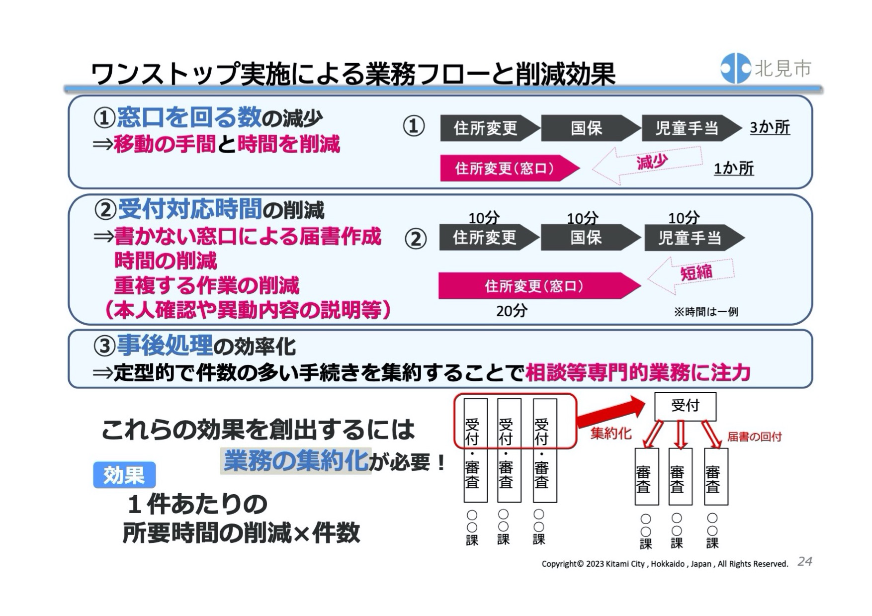 次にBPR(ビジネス・プロセス・リエンジニアリング)の手法で取り組まれていたことだ。BPRとは、業務本来の目的に向かって既存の組織や制度を抜本的に見直し、プロセスの視点で、職務、業務フロー、管理機構、情報システムをデザインし直すこと(北見市資料より引用)とされる。
