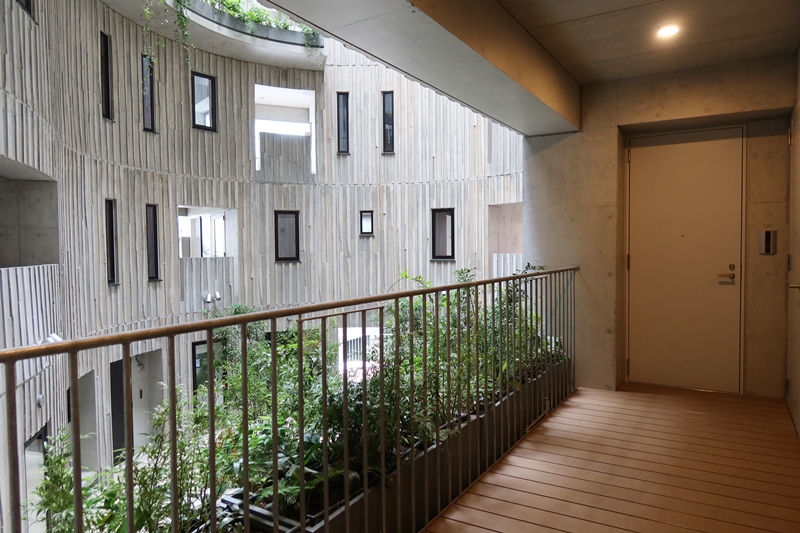 建物は公道側に入り口があり、中庭をぐるりと囲む。上階へのルートとしては公道側から見て右側にエレベーター、階段があり、左右を繋ぐ空中廊下が各階、エレベーター近くに用意されている。だが、それだけですべての階の、すべての住戸にアプローチできるわけではない。奥の住戸にアプローチするためにはどうしても廊下が要る。廊下を作らないと建物奥側にこの地域ではあまりニーズが高くないと思われる広い住戸ができてもしまう。