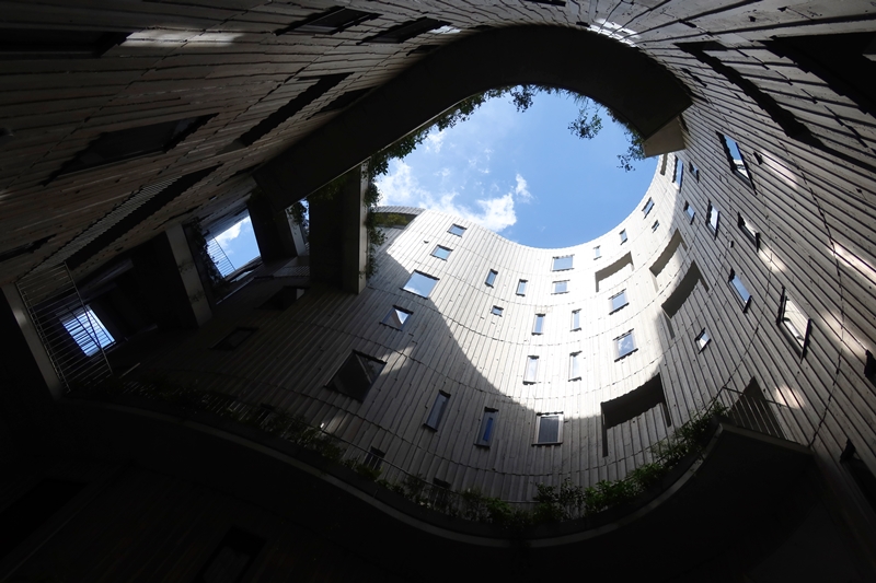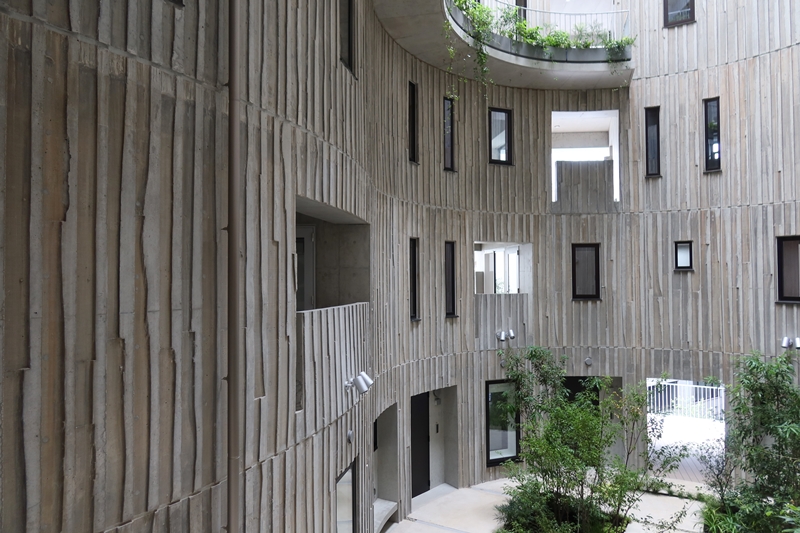 「中庭をつくり、各住戸両側の窓などから光、風が入ることを意図しました。一番広いところで建物の間口が18mあるので、中庭(直径約9m、吹き抜けの高さ約30m)がなければこれまた暗い部屋ができてしまうことが想定できました」。