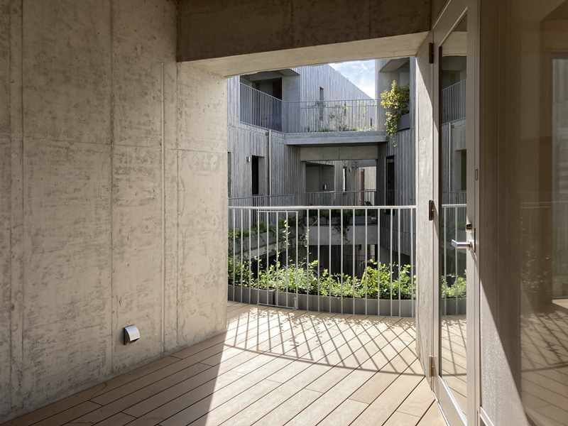バルコニーのつくりでは中庭に面した住戸では両脇にスリットの入ったコンクリートの柵になっている点が目をひいた。共用部の手すりは金属の縦格子で中庭から誰かがいることが透けて見えるが、専有部のバルコニーは誰かがいることは分かるが、分かるのはそこまで。