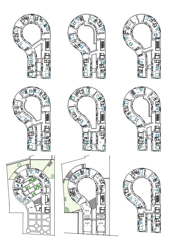 「フルボリュームでつくると現在の8階以上の高さの四角い建物になり、暗い部屋が生まれることが予想されました。最終的には予算に合わせて容積率に余裕のある既存と同程度の規模で新築することになり、次に建物の配置についてさまざまな検討の結果、2案を提案しました」