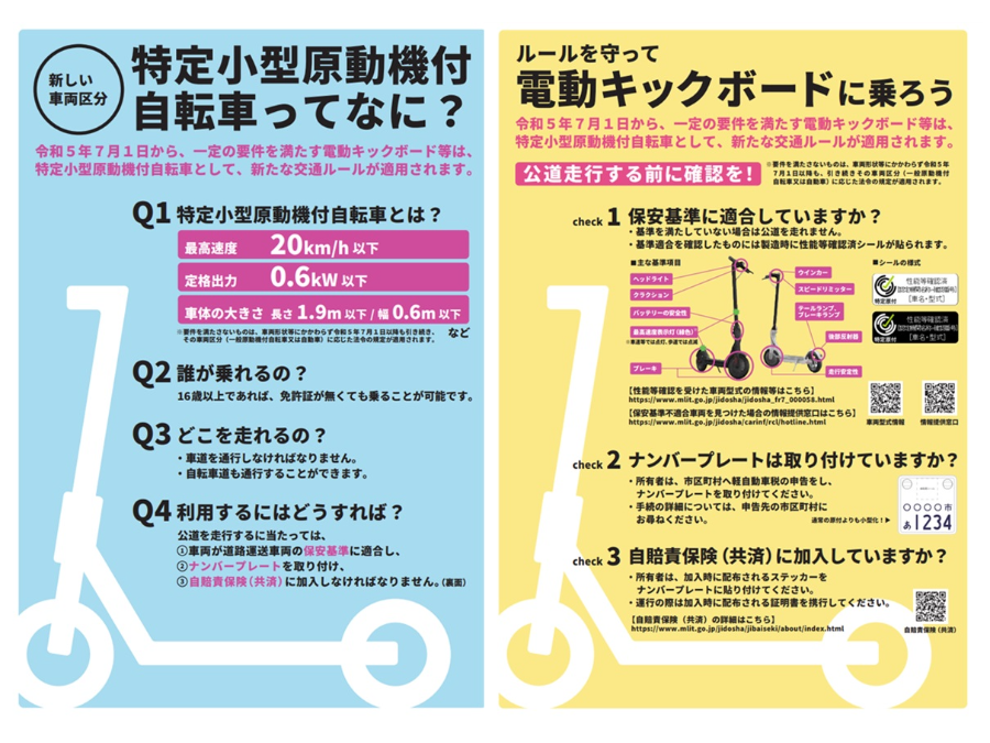 2023年7月1日より、道路法が改正されたことで一定の要件を満たす電動キックボードを「16歳以上なら無免許」で乗れるようになった。電動キックボードとは、2017年にシェアリング事業が登場し、2年間で世界中に広まった電動2輪モビリティのことである。自転車と比較して半分程度の体積であり、自転車5台駐輪するスペースに10台を駐輪できるコンパクト性を特徴としている。電動キックボードのシェアリングは各国で急速に普及しており、世界のシェアリングサービスにおいては自転車よりも電動キックボードのほうが普及している。