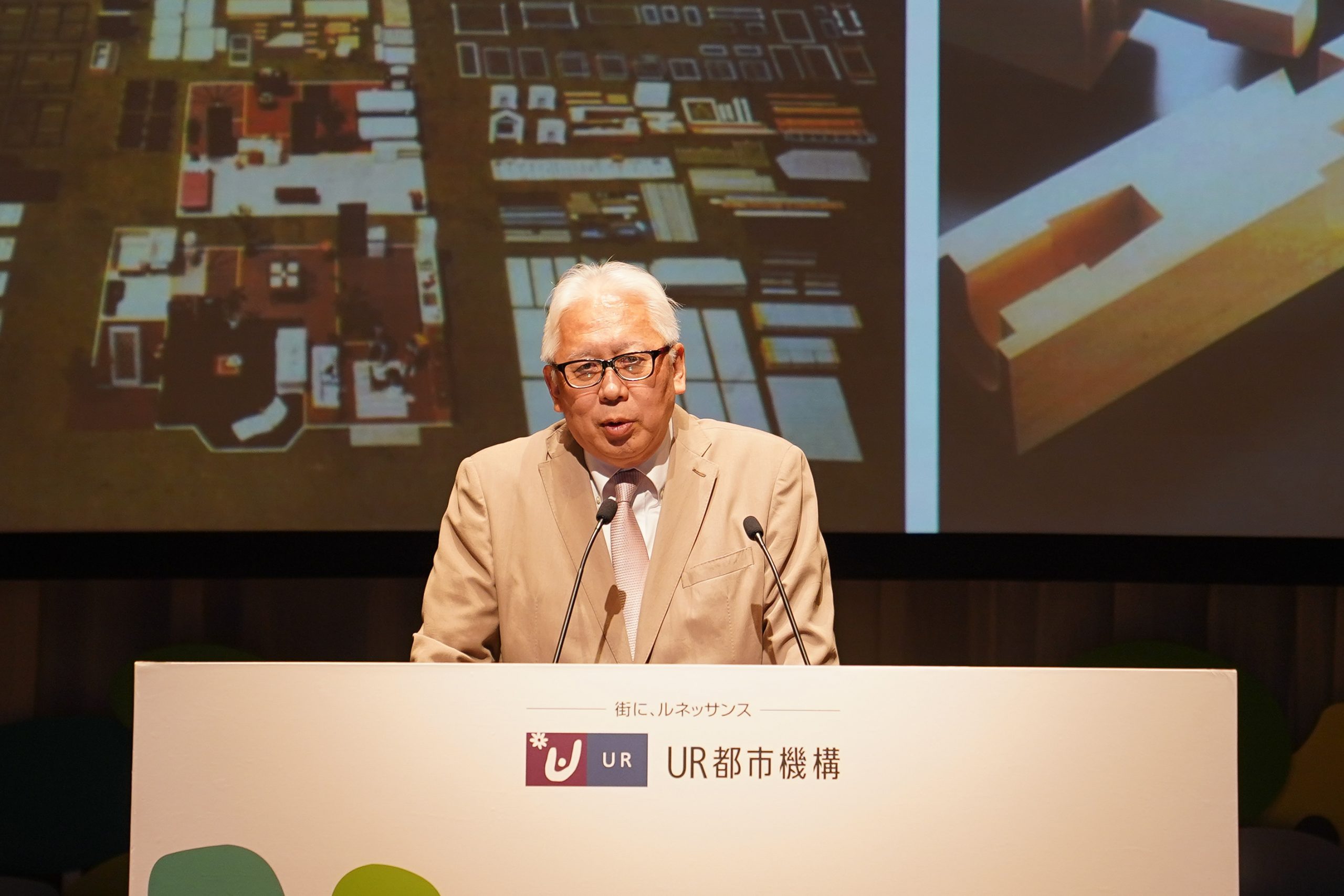 まずはUR理事長 中島正弘氏による開会の挨拶。「URも教科書に載るような歴史的価値のあるアパートや有名な先生が設計されたアパートなどもありましたが、建て替えと称して結構壊してしまったことを反省しています。そういうものを残し、歴史を知ることによって、未来が確かなものになります」という印象的な言葉でシンポジウムが幕を開けた。