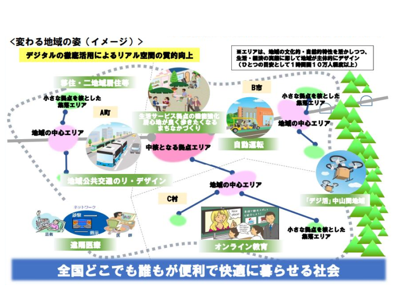 “地域生活圏”とは、通常の日常生活に必要なサービス、例えば地域交通、バスやタクシー、ライドシェアなどの移動周り、医療や福祉、学びといった暮らしに関わるサービスが過不足なく提供される地域を指す。人口減少社会において、上記3つのポイントを兼ね備えた地域生活圏は、人口10万人程度以上が目安だという。デジタルも活用すれば、例えば5万人の圏域でも、日常生活のサービスを十分維持できるとされる。