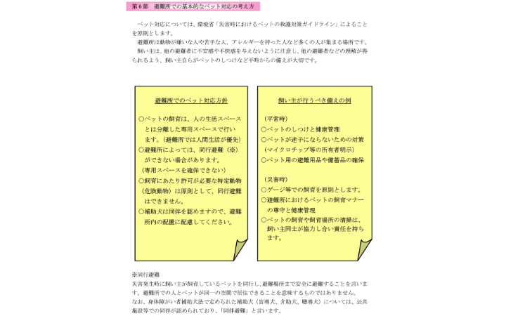 東日本大震災では、飼主や市町村等の災害担当部署にペットとの同行避難に関する意識が浸透しておらず、多くの飼主がペットを置いて避難し、災害後の対応に苦慮した経緯がある。