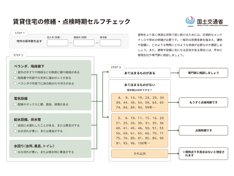 物件オーナーが適切な修繕を計画的に実施できるよう、国土交通省ではさまざまな支援を行っている。例えば、上述の『民間賃貸住宅の計画修繕ガイドブック』や『長期修繕計画作成時のセルフチェックシート』、『計画修繕事例集』などを作成して国土交通省ホームページに掲載している。こうした資料を活用することで、⾧期修繕計画を踏まえた経営シミュレーションを物件オーナー自身でできるようになる。
