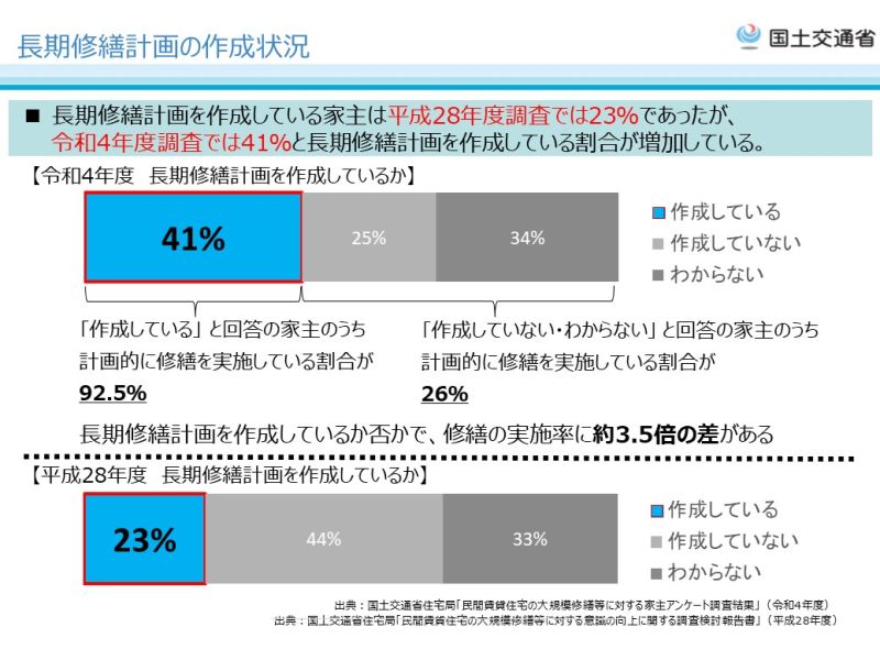 物件オーナーの計画修繕への関心は高まっている。図1.で示すとおり、長期修繕計画を作成している物件オーナーは2016年度調査では23%であったのに対し、2022年度調査では41%と増加している。修繕の実施率も、2016年度の21%から2022年度には37%へと増加している。資料によれば、長期修繕計画を作成しているか否かで、実際の修繕実施率に大きな差が出ている点も興味深い。長期修繕計画を作成したオーナーの方が、そうでないオーナーに比べ、3.5倍もの高い修繕実施率となったそうだ。長期修繕計画を作成することの大切さが如実に表れた結果といえる。