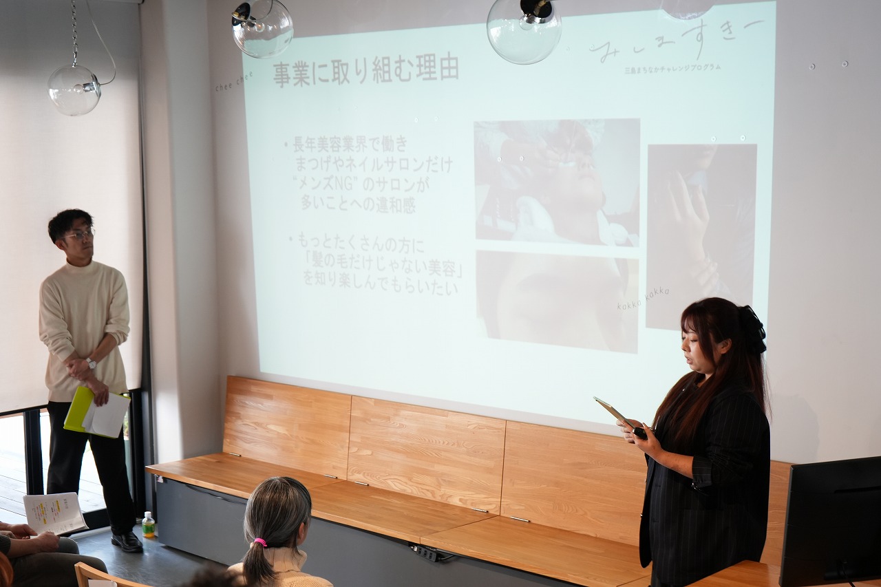 男性の美意識が高まる一方で、女性専用サロンが多い現状に一石を投じたプレゼンテーションは、ビジネスモデルとしての面白味や実現の可能性、そして三島のまちの向上にどれくらいつながるかなど、総合的に完成度が高い内容だったという。現在まちなかエリアでの開業に向け、着々と準備が進められている。