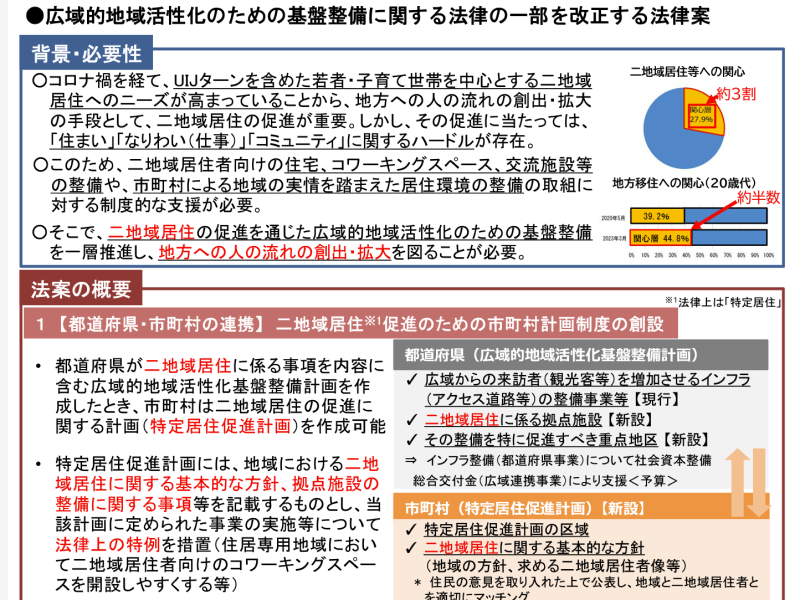 そのようななか、2024年5月、ニ地域居住を推進する法改正案が参院本会議で可決・成立された。これにより、市町村はニ地域居住を促進する計画(特定居住促進計画)を策定し、認定されれば、特例措置としてオフィスやワークスペースを整備しやすくなる。また、市町村が二地域居住を支援するNPO団体や企業を指定し、二地域居住促進の3本柱である「住まい」「仕事」「コミュニティ」に関する情報などを同法人や団体に提供できるようになった。