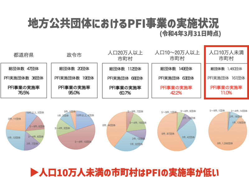 一方で、PPPには複雑な契約関係や手続きなどの契約予定者を決定するための適切な評価、長期にわたるプロジェクト管理などが必要となるなどの実施上の課題も存在する。例えば、PPPに関する入札・契約制度ならびにインフラ施設の技術的知識を有する職員がいない、または不足している自治体では、導入が難しい。こちら(下図)のデータは、人口規模別のPFI事業の実施状況の最新データだが、人口10万人未満の市町村の実施率は11%にとどまっており、人口10万人以上の市町村と比べて著しく低いことが分かる。