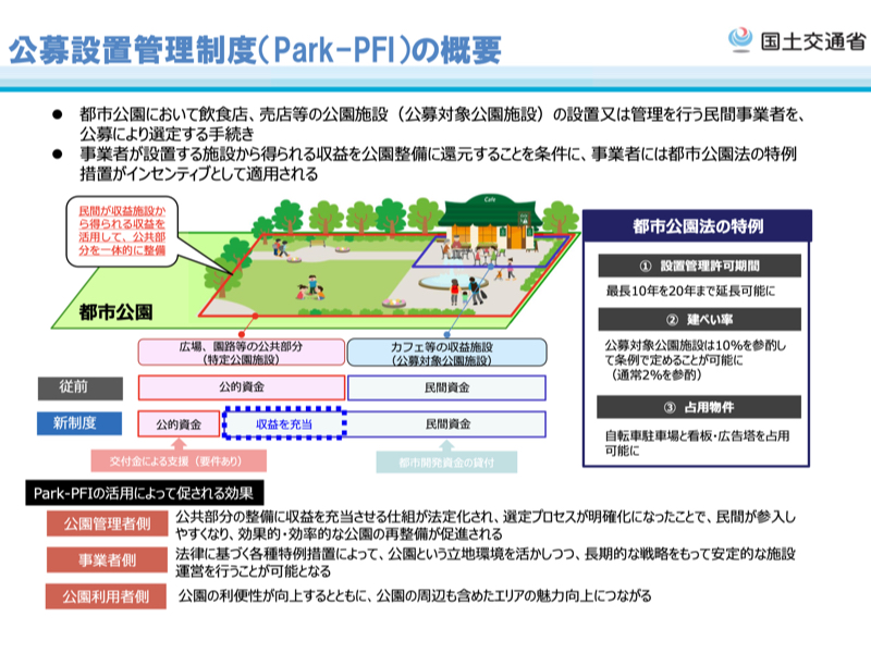 例えば、トイレのみ設置されている一般的な公園と、休憩施設として飲食店が併設されている公園とでは後者のほうが集客能力や滞在時間などで魅力的になることがある。もちろん公共施設の本来の役割によっては、公共サービス提供への民間企業の参入が一概に正しいというわけではないし、公共性が求められる都市空間でのビジネス臭に違和感を抱く方もいるかもしれない。