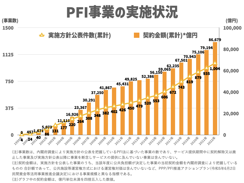 PFI法はその後、2011年に民間企業に対し公共施設の運営権を委ねるコンセッション方式が導入され、2023年改正ではPFI事業の対象にスポーツ施設や集会施設が追加されている。
