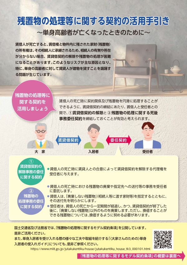 そこで、賃貸物件で60歳以上の単身高齢入居者が亡くなった場合、あらかじめ決めていた人と大家の間で契約を解除でき、残置物を円滑に処理できるよう締結する「モデル契約条項」が策定された。