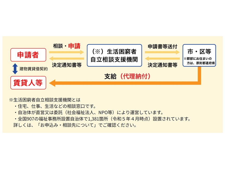 自立相談支援機関とは、生活困窮者自立支援法に基づいて市区町村(福祉事務所のない自治体の場合は都道府県)が開設している相談窓口だ。家賃の支払いに困っている人だけでなく、ひきこもり、多重債務、DV被害などさまざまな事情で生活に困っている人からの相談を受け付けて自立に向けた支援プランを提供している。なお、自立相談支援機関には、自治体の直営と民間事業者に委託しているものがある。各市区町村の自立相談支援機関は、下記厚生労働省のサイトで簡単に見つけることができる。