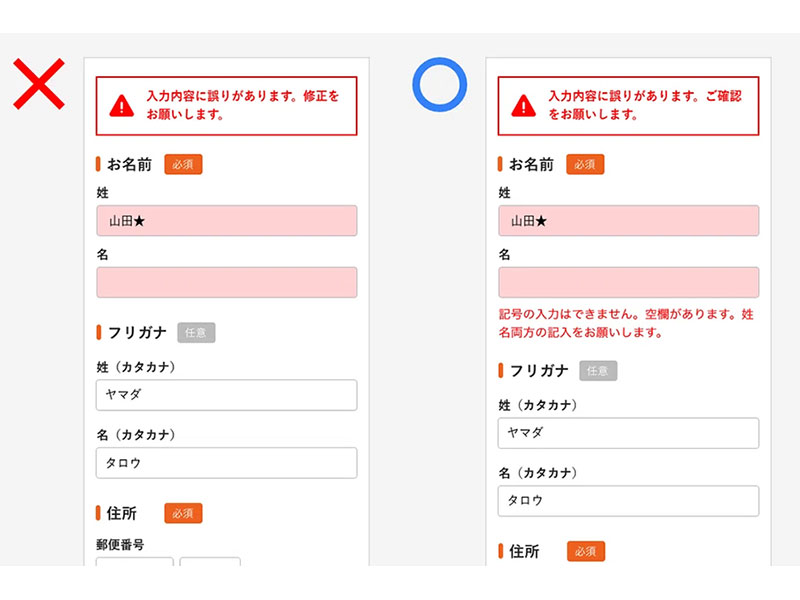 入力フォームの下に記入例を明記して入力エラーを回避したり、入力エラーがあった場合にはエラー箇所や修正方法を具体的に表示したりすると、スムーズに再入力ができるようになる。できるだけ利用者が分かりやすい仕様にすべきだろう。