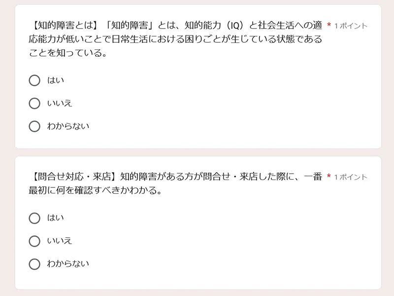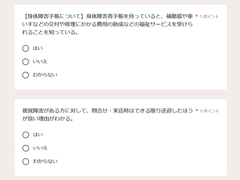 精神・発達障害、身体障害、知的障害を持つ方、それぞれのお客様を接客する際に必要なヒアリングや提案ができるかを問う内容になっている。